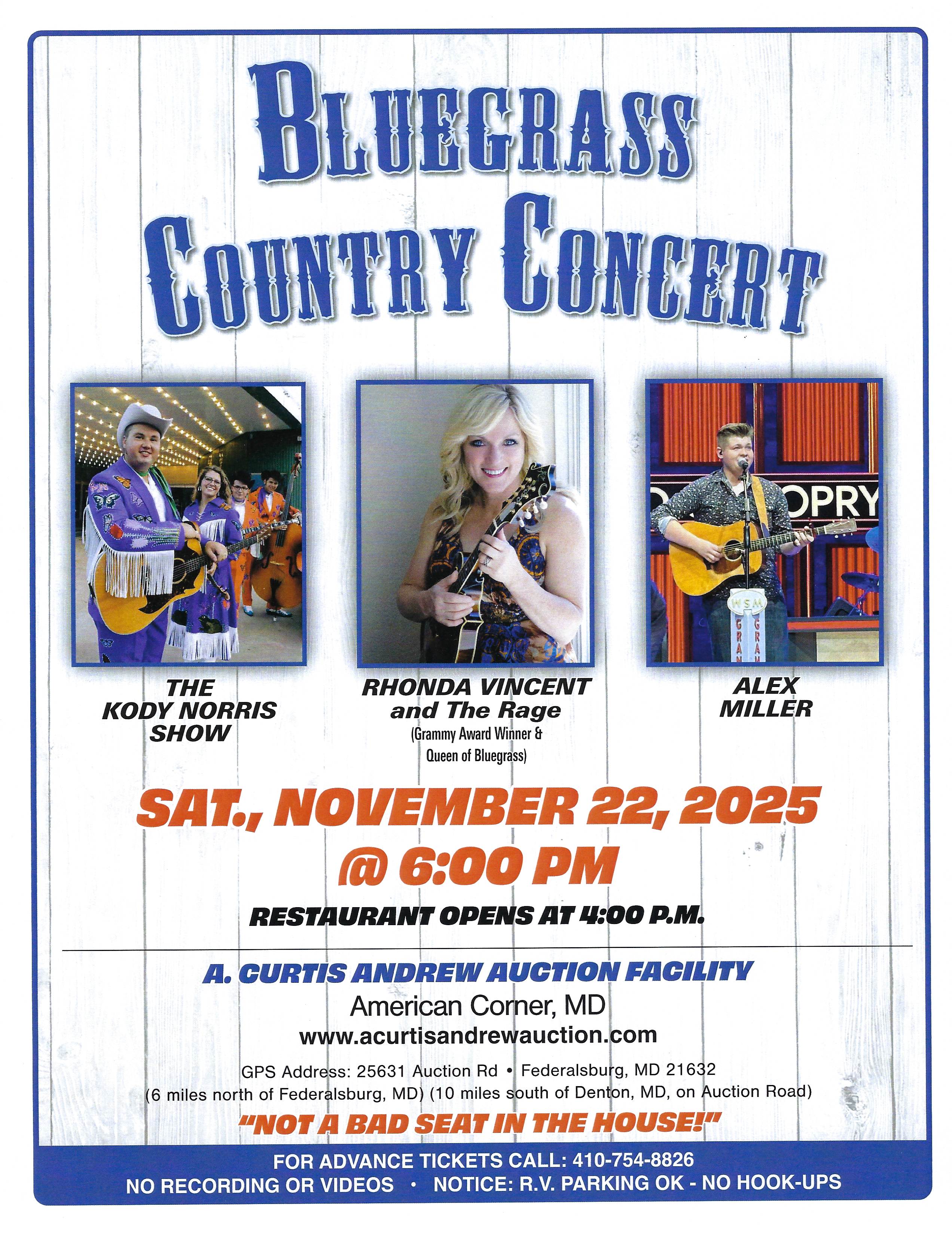 Bluegrass and Country Concerts are held in doors in our main complex since 1997. Our venue includes a stage, lights and a modern sound system. All seats are reserved, in a non-smoking and non-alcohol environment. Quality food available before and during concert. No RECORDING or VIDEOS of concert event. Over-night RV Parking allowed, however there are no electrical/septic hookups in the designated RV parking area. For more information regarding concerts and events, please call our office (410) 754-8826 or contact us via e-mail at info@acurtisandrewauction.com. Please continue to check our web for entertainer announcements, future concerts dates and or special events.